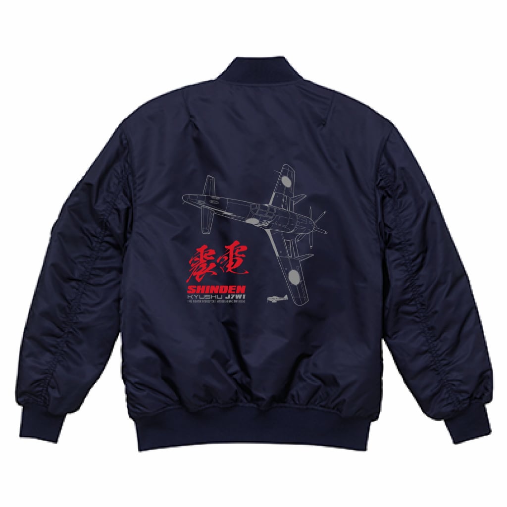 幻の戦闘機、震電 (モノカラー:グレー・赤) カッコいいMA-1タイプジャケット!(ネイビーブルー)
